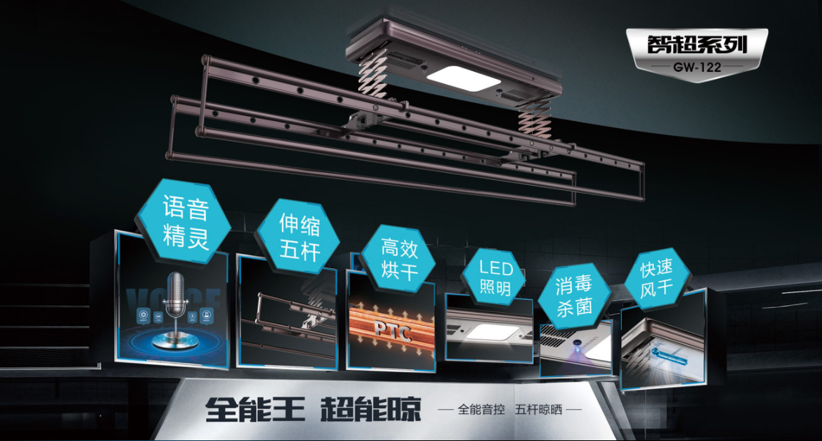 像好太太智能晾衣機GW-122系列,4伸縮桿加1小晾桿的設(shè)計就非常實用了。伸縮桿可已在1.6米到2.4米間自由切換,晾曬容量增加50%,最大承重35Kg,可實現(xiàn)同時晾曬10個人的衣物。利用中間的小晾干晾曬孩子衣物、貼身衣物和毛巾等小物件能最大限度的節(jié)省空間,并因正對消毒燈,達到最優(yōu)的消毒效果。